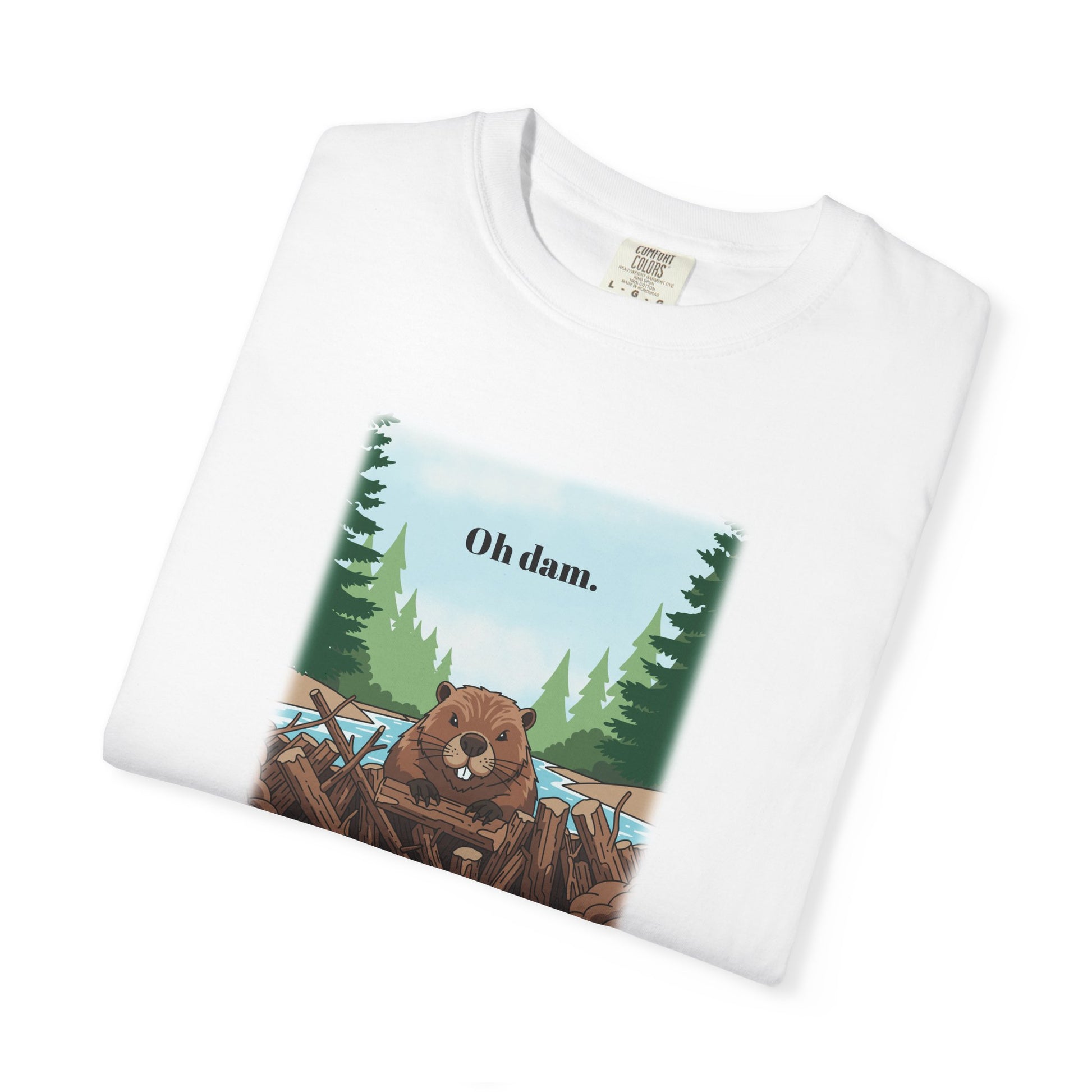 Oh dam! It's a beaver T-shirt! There isn't much more to say about this to be honest. It's a beaver t-shirt, it says 'Oh dam.' because beavers live in dams. It's pretty funny.